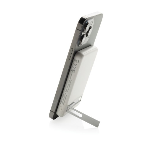 5.000 mAh pocket size powerbank with 5W magnetic wireless charger with a case made out of RCS certified recycled ABS plastic and FSC certified bamboo.. RCS (Recycled Claim Standard) is a standard to verify the recycled content of a product throughout the whole supply chain. Total recycled content: 22 % based on total item weight.The powerbank contains a long lasting grade A 5.000 mAh lithium polymer battery. With integrated phone stand. The power indicators will indicate the remaining energy level so you always know when to re-charge.; Type-C Input 5V/2.4A; Type C output:5V/2A.4A Item and accessories PVC free. Including RCS certified recycled TPE charging cable. Packed in FSC® mix packaging.