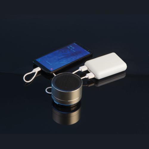 Plastic power bank with 10,000mAh power, charging cable and indicator. It can charge 2 smartphones/tablets at the same time, Input: 5V/2.1A - Output: 5V/2.1A.
