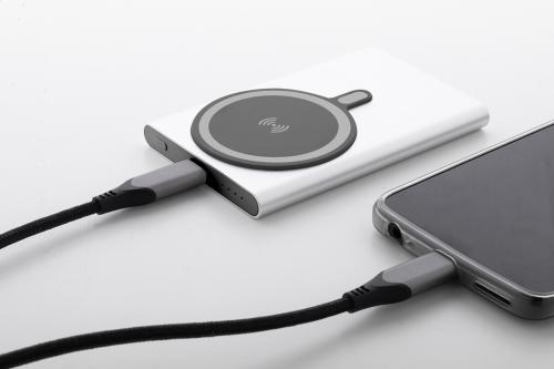 Recycled aluminium power bank with built-in magnetic wireless fast charger (15 W) and 5000 mAh battery. With USB-C input and charger port. Including self-adhesive metal ring to use the magnetic function on any wirelessly chargeable device. Compatible with iPhone® 12 or newer. Including USB charger cable.