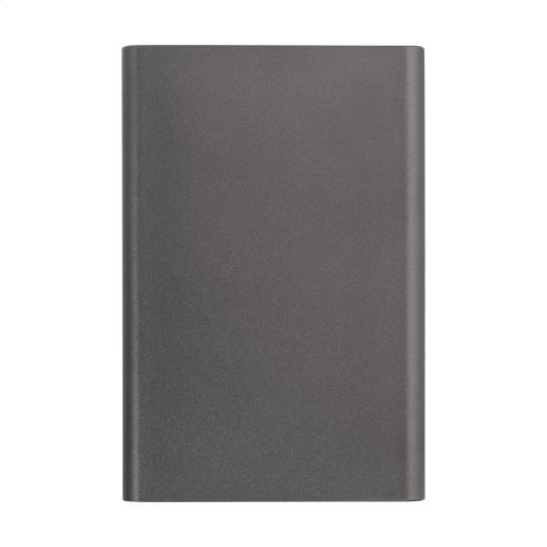 Recycled aluminium power bank with built-in magnetic wireless fast charger (15 W) and 5000 mAh battery. With USB-C input and charger port. Including self-adhesive metal ring to use the magnetic function on any wirelessly chargeable device. Compatible with iPhone® 12 or newer. Including USB charger cable.