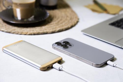 Recycled aluminium and bamboo power bank with 5000 mAh battery. With 1 USB and 1 USB-C charger ports. USB-C input port. Including USB charger cable.