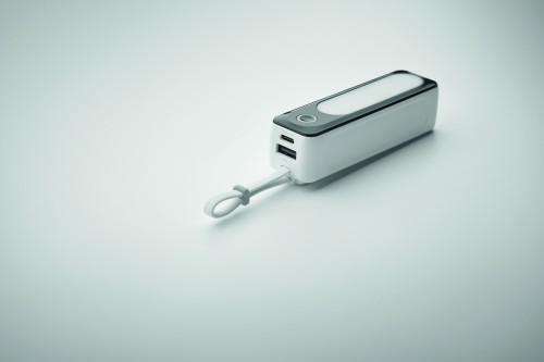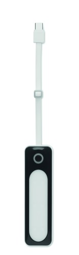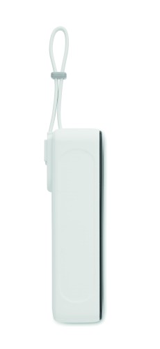 Powerbank with flashlight. 5000 mAh. ABS. Outputs: USB-C and USB-A up to 10W. Input: USB-C 10W. 6 COB lights (18 lm each). Built-in USB-C cable to USB-C cable with USB-A adapter included.
