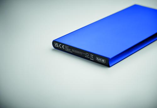 Powerbank. 8000 mAh. Recycled aluminium and RABS (GRS). Outputs: USB-C and USB-A up to 10W. Input: USB-C 10W. USB-C to USB-C cable (2A) with USB-A adapter included.