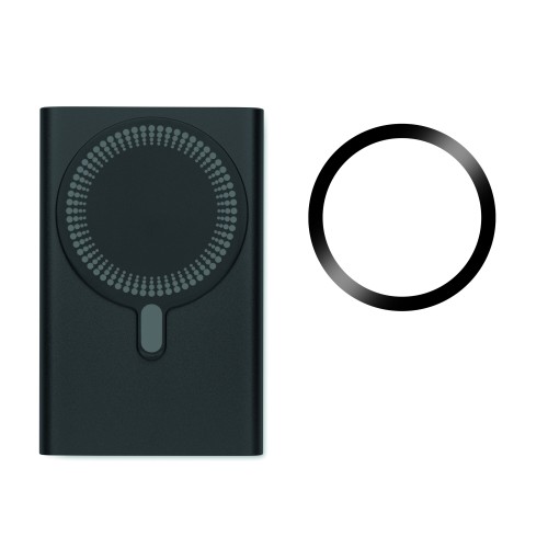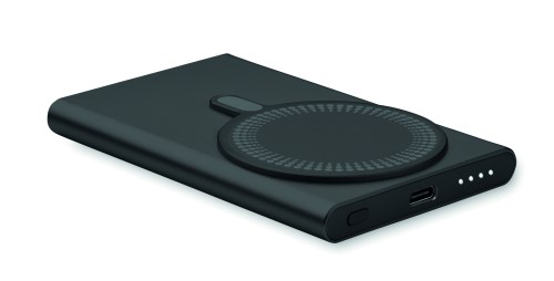 Magnetic wireless powerbank PD 20W. 5000 mAh. Recycled aluminium (GRS). Outputs: USB-C up to 20W. Wireless charging up to 15W. Input: USB-C 18W. 4 LED indicators. USB-C to USB-C cable with USB-A adapter and magnetic ring included.