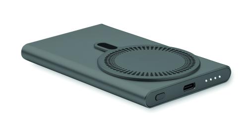 Magnetic wireless powerbank PD 20W. 5000 mAh. Recycled aluminium (GRS). Outputs: USB-C up to 20W. Wireless charging up to 15W. Input: USB-C 18W. 4 LED indicators. USB-C to USB-C cable with USB-A adapter and magnetic ring included.