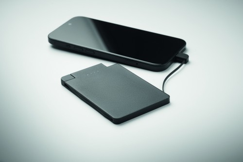 Magnetic powerbank with built-in cables. 2500 mAh. ABS and iron. Outputs: USB-C and USB-A up to 10W. Input: USB-A 10W. Built-in cables for iOS and USB-C devices. 4 LED indicators. USB-C to USB-A cable included