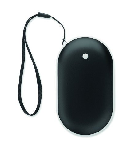 Aluminium electric hand warmer with 3 heat levels (45°C, 50°C, 55°C) and built-in 5000mAh power bank. Dual-sided heating, Type-C input/output, USB-A and DC5V/2A output and charging cable included.