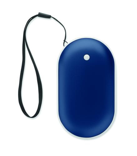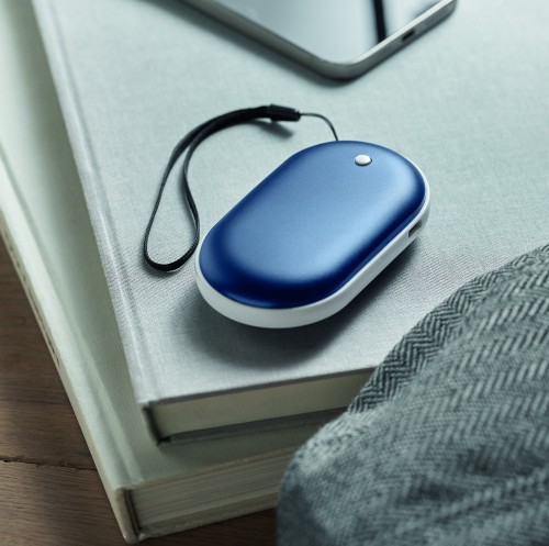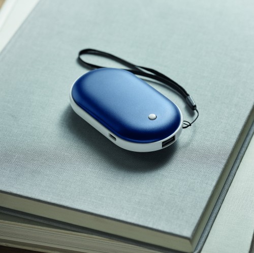 Aluminium electric hand warmer with 3 heat levels (45°C, 50°C, 55°C) and built-in 5000mAh power bank. Dual-sided heating, Type-C input/output, USB-A and DC5V/2A output and charging cable included.