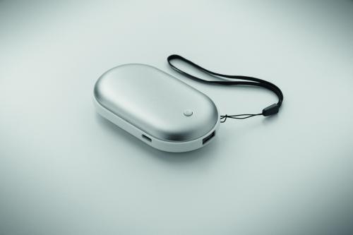 Aluminium electric hand warmer with 3 heat levels (45°C, 50°C, 55°C) and built-in 5000mAh power bank. Dual-sided heating, Type-C input/output, USB-A and DC5V/2A output and charging cable included.