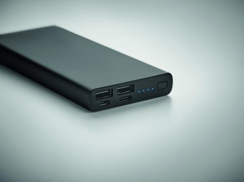 Powerbank PD 18W. 10000 mAh. Recycled aluminium and ABS (GRS). Outputs: USB-C up to 20W and 2 USB-A up to 18W. Input: USB-C and Micro-B 18W. 4 LED indicators. USB-C to USB-C cable (2A) with USB-A adapter included.