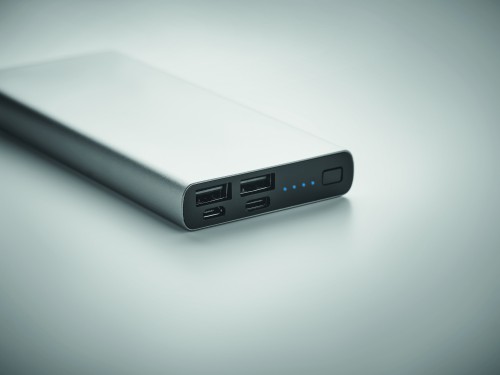 Powerbank PD 18W. 10000 mAh. Recycled aluminium and ABS (GRS). Outputs: USB-C up to 20W and 2 USB-A up to 18W. Input: USB-C and Micro-B 18W. 4 LED indicators. USB-C to USB-C cable (2A) with USB-A adapter included.