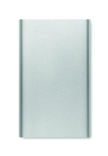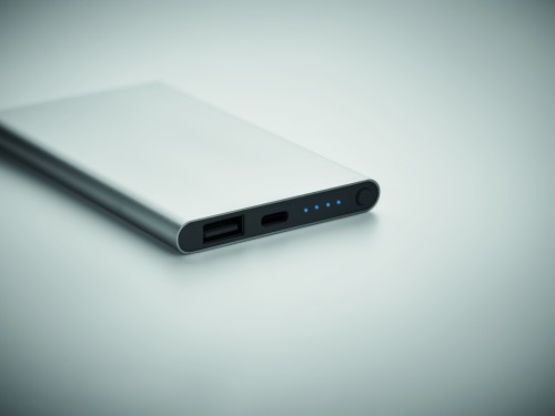 Powerbank. 4000 mAh. Recycled aluminium and ABS (GRS). Outputs: USB-C and USB-A up to 10W. Input: USB-C 10W. USB-C to USB-C cable (2A) with USB-A adapter included.