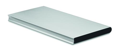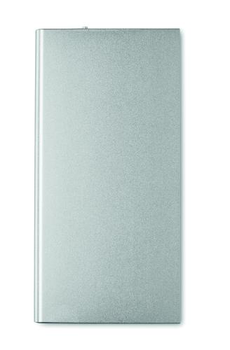 Powerbank. 8000 mAh. Recycled aluminium and ABS. Outputs: USB-A up to 10W. Input: USB-A 5W. 4 LED indicators. Built-in Micro USB plug. USB-A to Micro USB cable (30 cm) included.