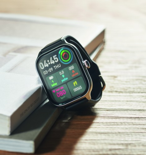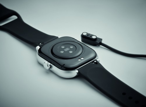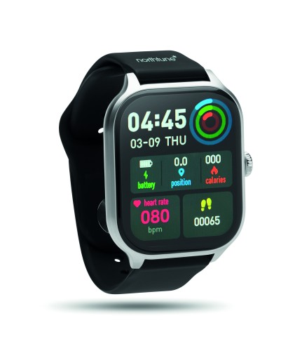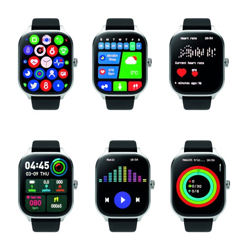 5.4 wireless smart health watch in zinc alloy with silicone strap. 2.01 inch touch LCD display. Rechargeable Li-Pol 180 mAh battery. Requires a free app (HryFine available in both iOS and Android).