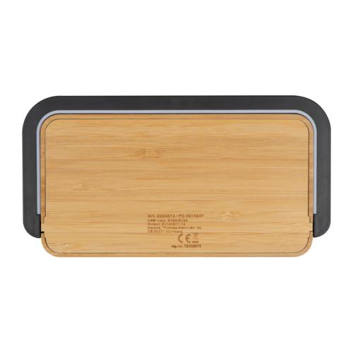 10 Watt bamboo wireless charger with reading lamp for smartphones, including a charging cable. Charges all QI-enabled smartphones. Your logo will be engraved on the charger.