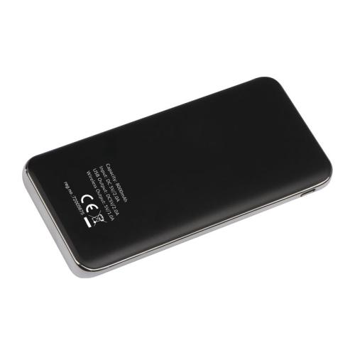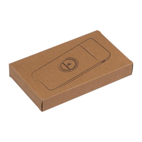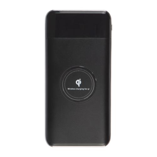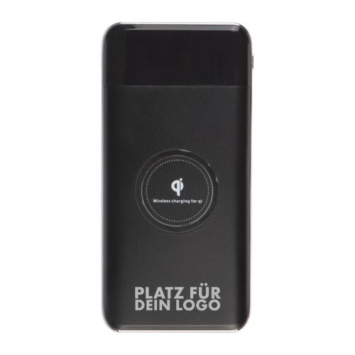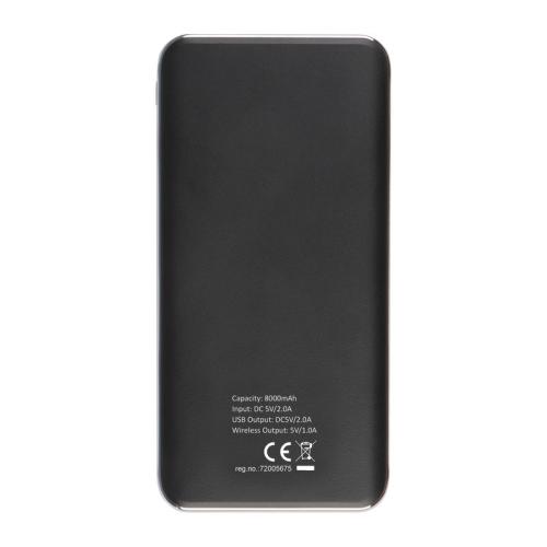 Wireless metal power bank with 8000 mAh capacity and USB charging cable for Android and iOS QI-enabled smartphones. Just place your smartphone on the powerbank and it will charge automatically.