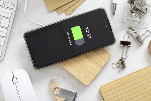 Wireless fast charger (10W) in pallet shaped bamboo housing. Including USB charger cable.