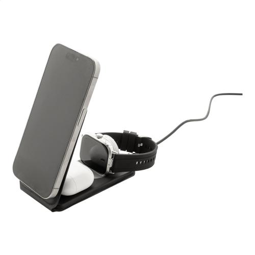 Luxury, foldable mobile phone holder and wireless charger set in recycled PU leather. With magnetic wireless fast charger (15W), wireless charger (5W) for earphones (Apple® only) and wireless charger (2,5W) for smart watches (Apple® and Samsung®). Including self-adhesive metal ring to use the magnetic function on any wirelessly chargeable device. Compatible with iPhone® 12 or newer. Including USB charger cable.