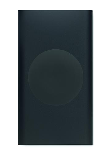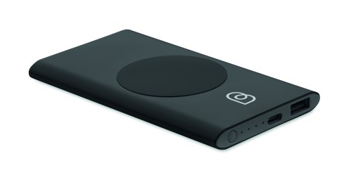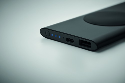 Wireless powerbank. 5000 mAh. Recycled aluminium and ABS (GRS). PD 18W. Outputs: USB-C 20W and USB-A up to 18W. Wireless charging up to 15W. Input: USB-C 18W. USB-C to USB-C cable (2A) with USB-A adapter included.