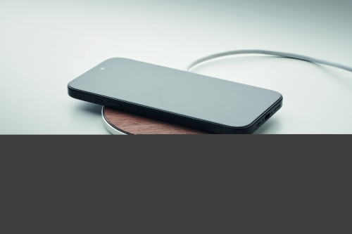 Wireless charger in recycled aluminium with walnut top detail. Connect device to your computer, place smartphone on it and allow it to charge. Output: DC 9V/1.67A (15W).