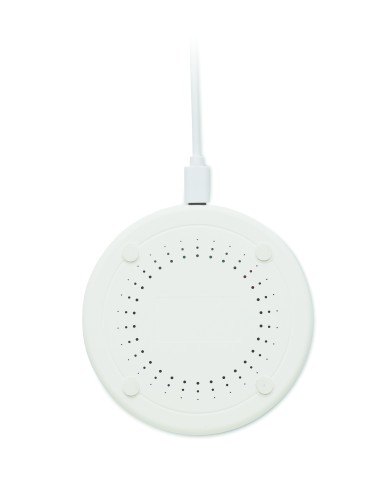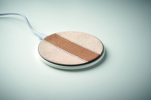 Wireless charger in recycled ABS with cotton and cork detail. Connect to your computer, place smartphone on it and allow it to charge. Output: DC 9V/1.67A (15W).