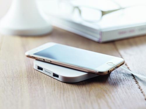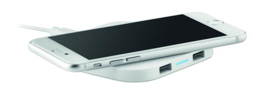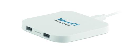 Charging pad with 2 port 2.0 hubs and USB port computer to create wireless charging dock for smartphones. Output: DC 9V/1.67A (15W).