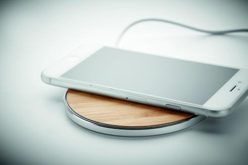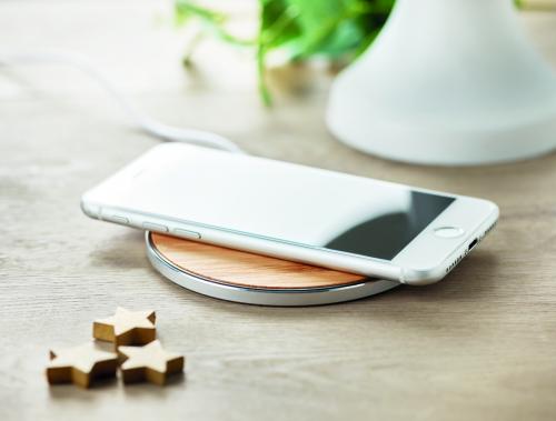 Wireless quick charger in bamboo and aluminium. Blue light lit when charging. Output: DC9V/1.1A (10W). Bamboo is a natural product, there may be slight variations in colour and size per item, which can affect the final decoration outcome.
