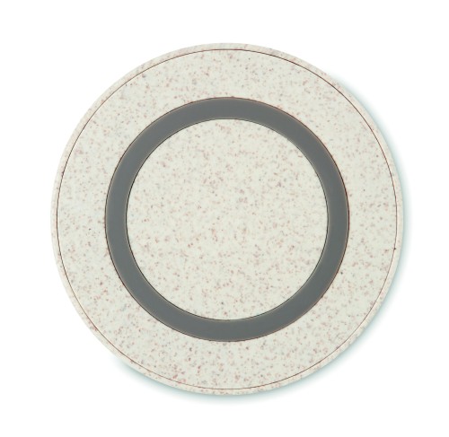 Wireless charger in wheat straw (35%) and ABS (65%). Connect device, place smartphone on it to begin charging. Output: DC5V/1A (5W).