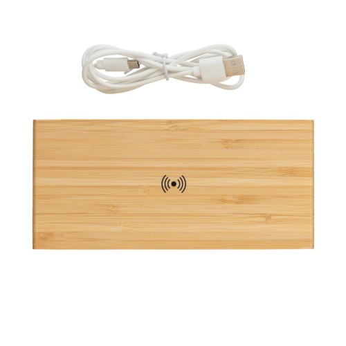 5W wireless charger alarm clock with complete bamboo exterior and 24 hour time indicator. With USB port on the backside to charge via cable. Including 150 cm PVC free TPE micro usb cable. Compatible with all QI enabled devices like Android latest generation, iPhone 8 and up Input: 5V/1.5A; Wireless Output: 5V/1A - 5W; 1 USB output port, 5V/1A.