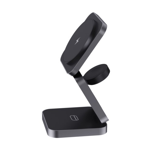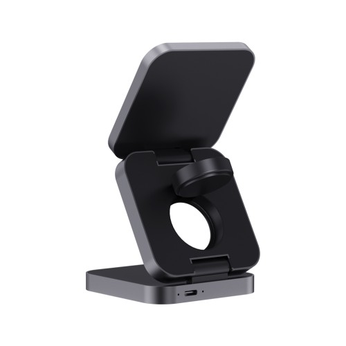 Luxury and foldable 3-in-1 wireless charger made with RCS recycled ABS and RCS recycled Aluminum. Total recycled content: 46% based on total item weight. RCS certification ensures a completely certified supply chain of the recycled materials. The wireless charger comes equipped with a magnetic 15W wireless charger and an additional 5W wireless charger suitable for earbud cases or other small wireless chargeable devices and a 2.5W wireless charger for smartwatches ( Apple watches only). Including RCS certified 120cm recycled TPE cable. Packed in FSC® mix kraft packaging. Item and accessories 100% PVC free. Input: 9V/3A for optimal use. Output: Phone: 9V/1.1A; 9V/1.67 A/(15W), Earbuds: 5V/1A (5W), Watch: 5V/0.5A. PVC free.