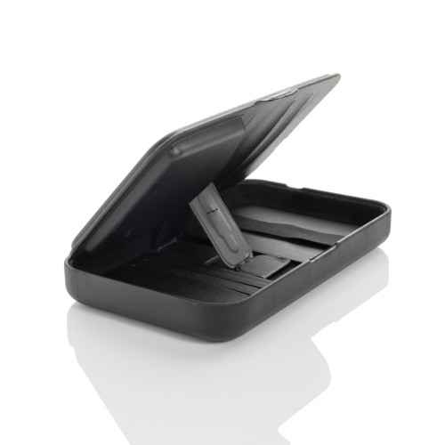 Hard shell travel case with integrated 3-in-1 wireless charger made with RCS recycled PU Total recycled content: 5% based on total item weight. RCS certification ensures a completely certified supply chain of the recycled materials. The travel case has storage space for passport, multiple cards and has an integrated cable holder. The travel case comes equipped with a magnetic 15W wireless charger and an additional 5W wireless charger suitable for earbuds cases or other small wireless chargeable devices and a 2.5W wireless charger for smartwatches ( Apple watches only). Perfect to carry all your valuables and charge all your devices. Inside is also a small magnetic wallet that can be taken out. Including 120 cm TPE cable. Packed in FSC® mix packaging. Item and accessories 100% PVC free. Minimum Input: 9V/3A for optimal use. Output: Phone: 9V/1.1A; 9V/1.67 A/(15W), Earbuds: 5V/1A (5W), Watch: 5V/0.5A.