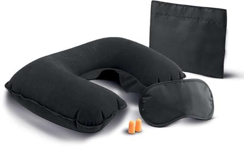 Includes ear plugs, sleep mask and inflatable neck cushion
