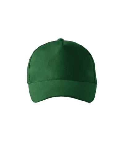 five-panel design, bonded front panel, stitched, slightly curved peak, embroidered air holes, sweatband, size adjustable by brass clip