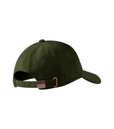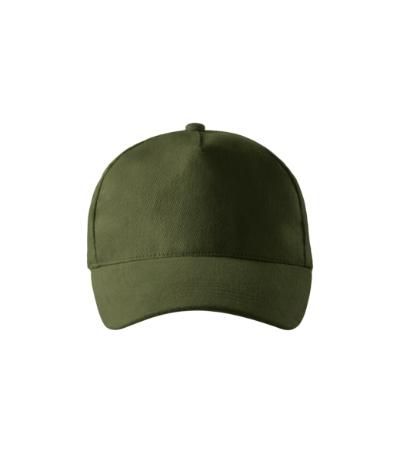 five-panel design, bonded front panel, stitched, slightly curved peak, embroidered air holes, sweatband, size adjustable by brass clip
