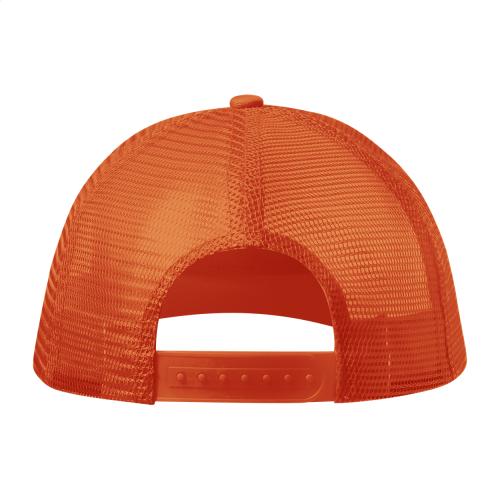 5 panel baseball cap with mesh back and plastic size adjustment strap, polyester.