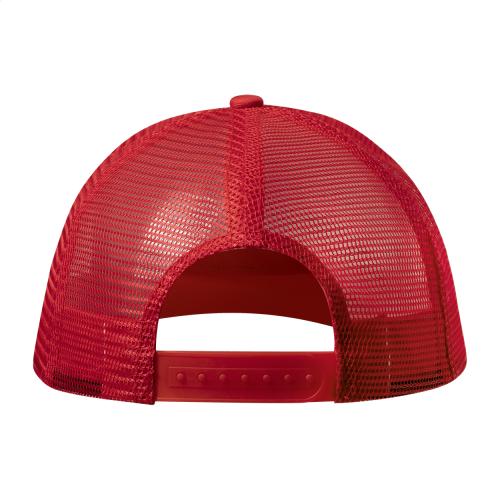 5 panel baseball cap with mesh back and plastic size adjustment strap, polyester.