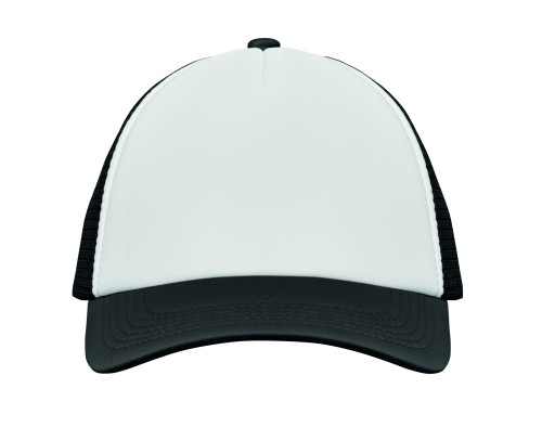 5 panel truckers cap in polyester 140-150 gr/m² with adjustment plastic snap closure. White front panel and colour visor in polyester jersey with foam backing. Other panels in colour mesh. Size 7 1/4.