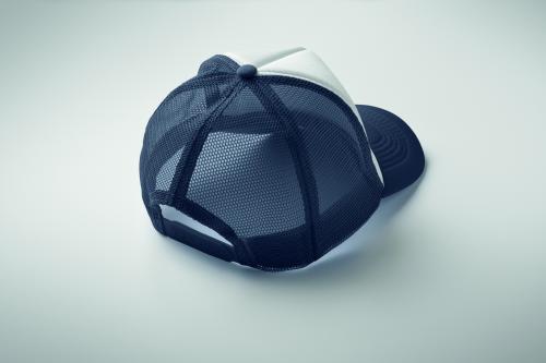 5 panel truckers cap in polyester 140-150 gr/m² with adjustment plastic snap closure. White front panel and colour visor in polyester jersey with foam backing. Other panels in colour mesh. Size 7 1/4.