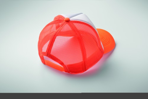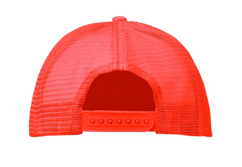5 panel truckers cap in polyester 140-150 gr/m² with adjustment plastic snap closure. White front panel and colour visor in polyester jersey with foam backing. Other panels in colour mesh. Size 7 1/4.