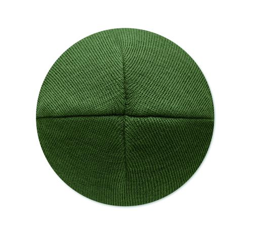 Unisex knitted beanie in soft stretchable RPET polyester with cuff and patch.