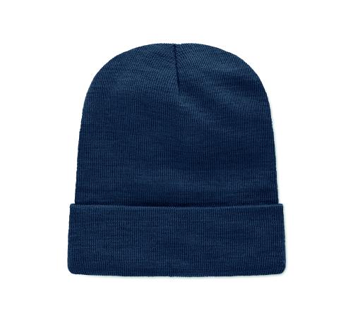 Unisex knitted beanie in soft stretchable RPET polyester with cuff and patch.