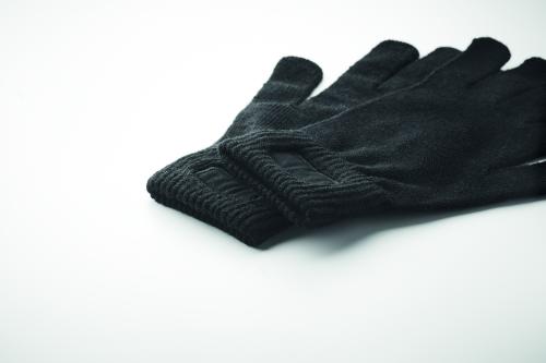 Knitted gloves in soft stretchable RPET polyester with decoration patch.