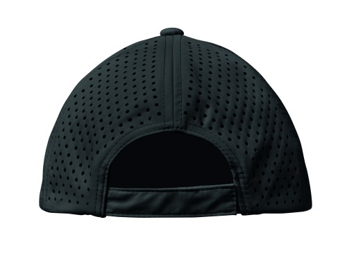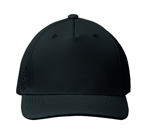 5 panel polyester performance cap with adjustable hook and loop closure and laser perforated holes with 2 stitched eyelets in matching colour. Item is quick dry, sweat and water repellent. 130 gr/m²