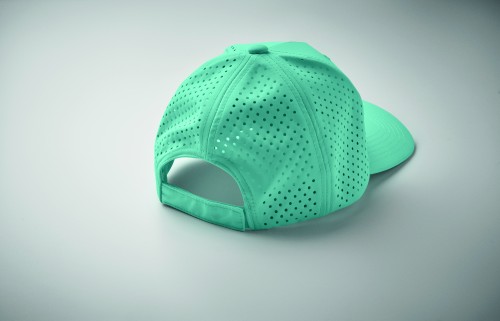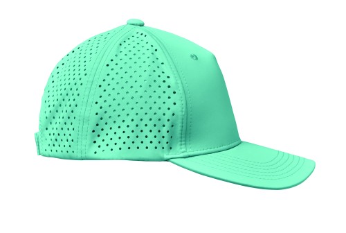 5 panel polyester performance cap with adjustable hook and loop closure and laser perforated holes with 2 stitched eyelets in matching colour. Item is quick dry, sweat and water repellent. 130 gr/m²