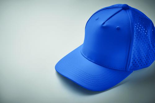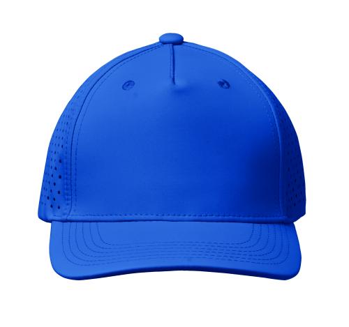 5 panel polyester performance cap with adjustable hook and loop closure and laser perforated holes with 2 stitched eyelets in matching colour. Item is quick dry, sweat and water repellent. 130 gr/m²