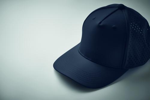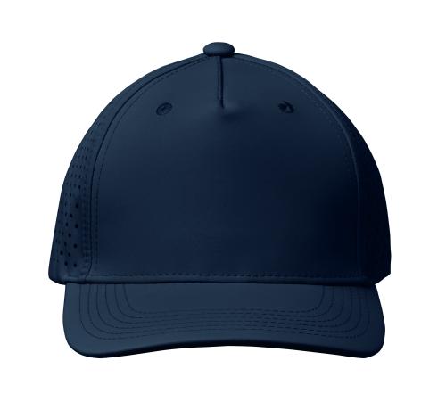 5 panel polyester performance cap with adjustable hook and loop closure and laser perforated holes with 2 stitched eyelets in matching colour. Item is quick dry, sweat and water repellent. 130 gr/m²