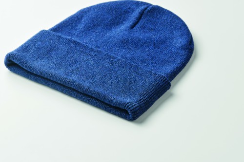Unisex knitted beanie hat in soft stretchable polyester (64%) and acrylic (36%) with rolled up cuff. A stretchy one-size-fits-all design.