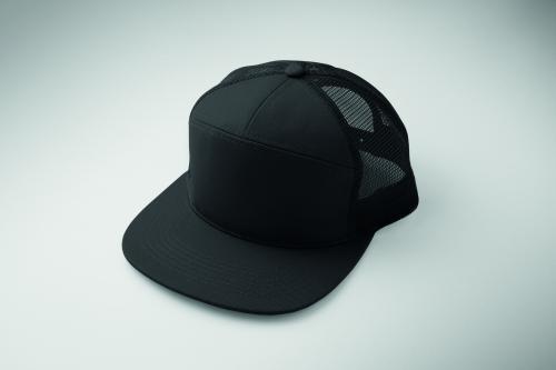 7 panel flat visor cap in cotton twill 235 gr/m² with polyester mesh backside and plastic closure.