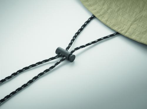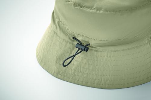 Water repellent fisherman hat made of polyester, includes self material pouch with ABS carabiner. 64 gr/m².