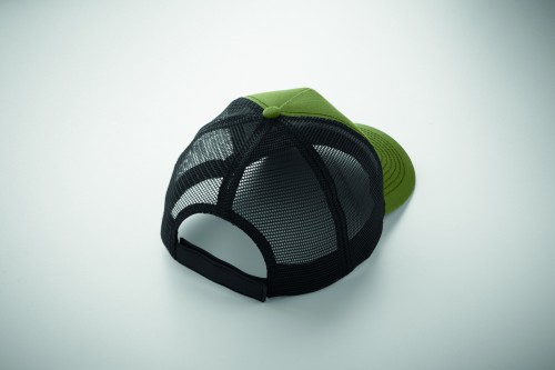 5 panel trucker cap with front panel and visor in 250 gr/m² cotton, back mesh in polyester, hook and loop closure.